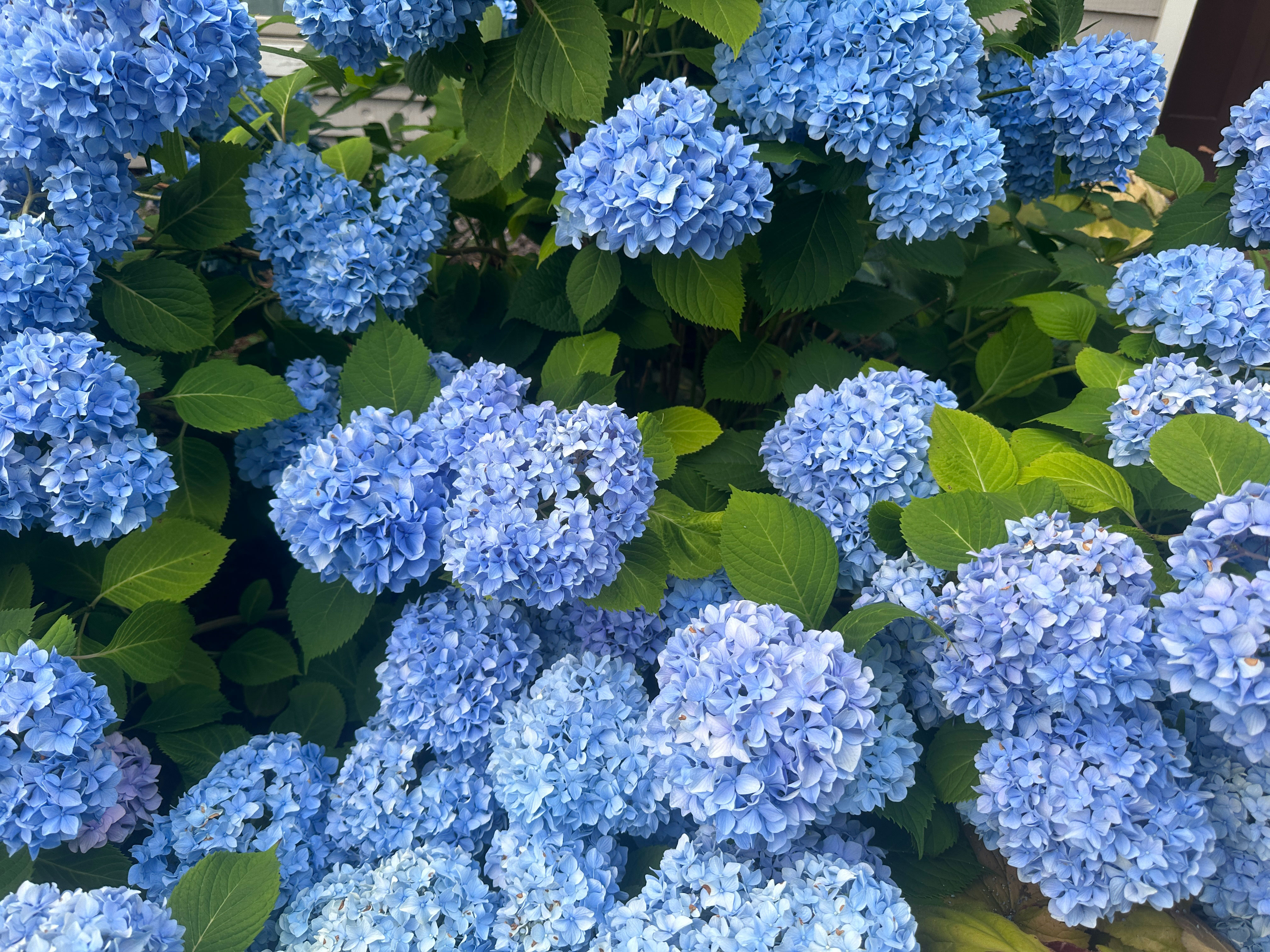 The first tip in getting a hydrangea in the color you want is to buy a hardy variety for your zone. Make sure to plant them in a partial sun location or even a shady spot. Here are my Endless Summer Blue Hydrangeas covered with vibrant blue flowers, which we often see when we visit many New England towns.